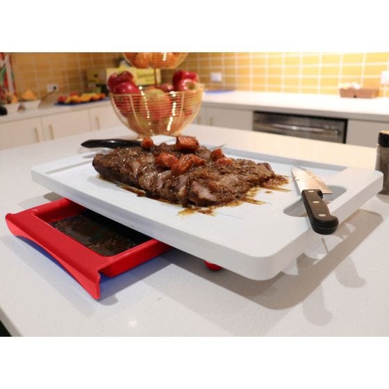 The dripless 2-in-1 carving system is the perfect carving and cutting system solution for every cook, chef or foodie which eliminates the mess and reduces the stress when carving or cutting everything from meat, fowl and fish to fruits and vegetables. Enjoy effortless carving with special spikes holding the food in place as the dripping tray catches the juices. By capturing excess juices, it not only keeps the counter clean, but also preserves the rich flavors in the juices. Includes a non-toxic cutting board ensuring that your food stays safe and free from harmful chemicals. Made from high-quality, BPA-free plastic. Dishwasher safe. Made in USA. 20.2" x 13" x 2.5”.