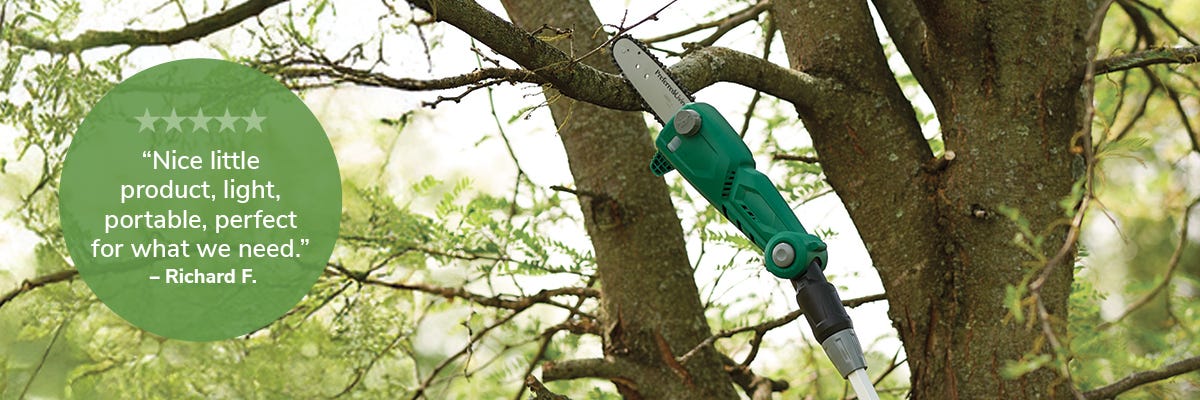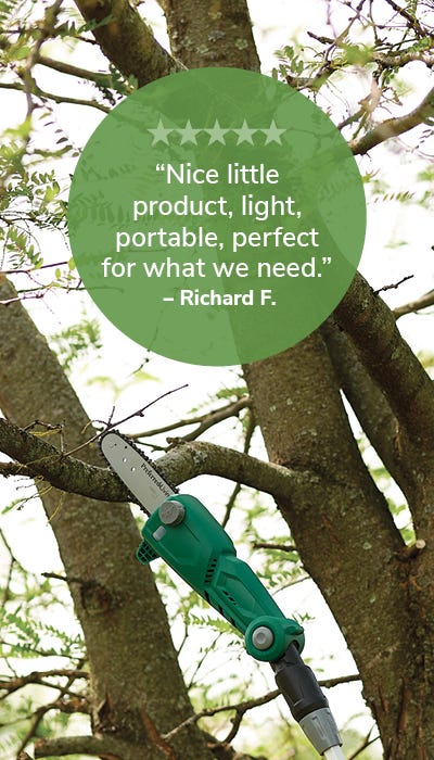Trimming high branches doesn’t have to be a daunting task. This Cordless Pole Saw is powered by a 20v rechargeable lithium battery and telescopes to over 7'l so you can reach limbs high off the ground with no tedious cord to drag around! Saw head has a generous 8" Oregon bar and chain that adjusts from 0° to 45°. Tool-less chain adjustment and the automatic bar and chain lubrication ensures proper use. Includes rechargeable 20v Li-ion battery pack, charger and shoulder strap. Measures about 5'9"l, telescopes over 7'l. Weighs less than 7 lb.