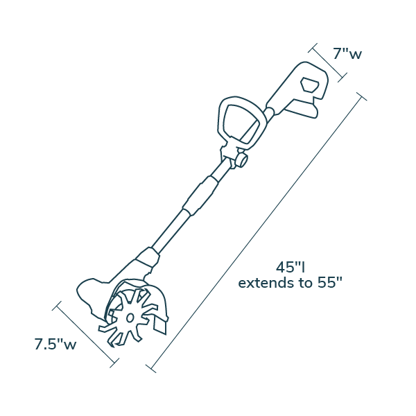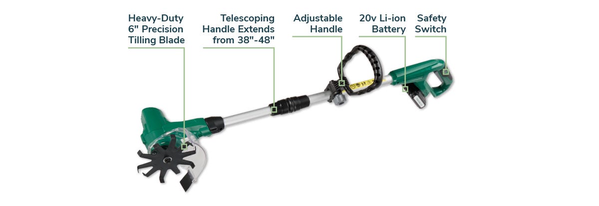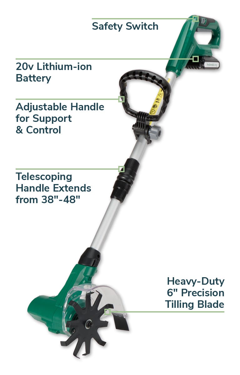 This Cordless 20v Precision Tiller is the perfect power weeder with its single 6" steel tilling blade and lightweight design it’s easy to till around the most delicate plants. Tilling blade digs a 2 1/2” deep path in a single pass and effortlessly slice away weeds while it loosens soil to allow air and moisture to penetrate for healthier roots and plants. Tiller features a telescopic handle that extends from 38" to 48" to take the pain and strain out of garden work. Includes 20v lithium battery and charger. Weighs less than 4 lb.