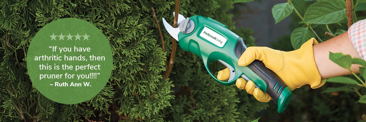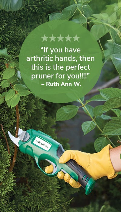 Pruner lets you work effortlessly – The Toucan Tools™ Rechargeable Power Pruner eliminates the strain associated with squeezing conventional manual pruners while landscaping and gardening. Perfect for green wood, woody stems, twigs and branches up to 0.39" dia., it provides a clean, precise cut. Cutting is as simple as squeezing a trigger, and the 3.6v battery provides up to 600 cuts on a single charge. Pruner takes a bothersome task and makes it effortless—it’s actually fun to use! Ergonomic handle provides a secure, comfortable grip, and a built-in safety switch prevents accidental cuts. Ideal for those who suffer from arthritis or whose hands are not as strong as they used to be. Includes charger. Measures about 12"l x 2"w x 3 1/2"h and weighs less than 1 1/2 lb.