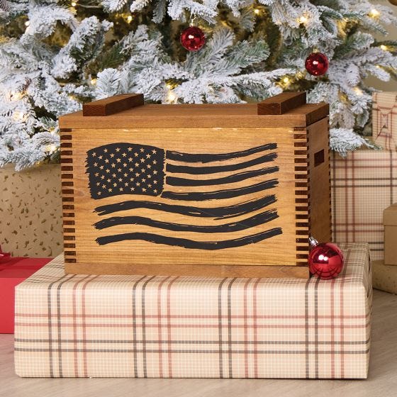These attractive boxes are made of high quality solid native pine and features rugged hardware and finger-joint construction. Ideal for storing ammunition and hunting accessories or anything that you want stored in a handsome box. Features handles on both sides for easy carrying. Measures about 16"l x 8 1/4"d x 10 1/2"h. Made in the USA.