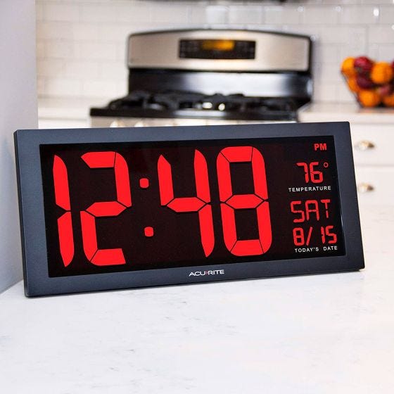 No More Squinting! Check the time from anywhere in the room! Big, bright, red 4.25” letters make reading easy from a distance. Includes time, indoor temperature, date, day of the week. Powered by an extra-long 9’ AC adapter (2 AA battery back-up - not included). Wall-mountable or sits upright for desktop use. Measures 14.5"L x 6"H x 2"D.