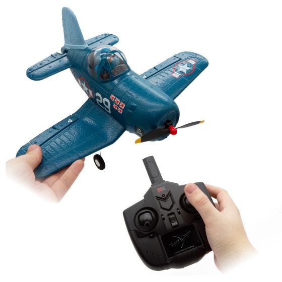 Miniaturized in the form of an F4U Corsair, this R/C airplane is excellent for beginners and skilled pilots. Powered by a 1-cell, 350mAh battery and 1020kv brushless motor, it boasts excellent flight performance, with 2-gram micro servos for precise control. With switchable 3D/6G modes and "Safe" automatic leveling system, aerobatics are a breeze. Made of high durability EPO foam to withstand hard landings and includes a breakaway propeller that resists damage. Each flight can last up to 15 minutes, assisted by an integrated gyroscope which smooths your inputs and can automatically level the aircraft. An included charger quickly recharges the battery do your back to flying in no time. R/C measures 10.75”l with a 13.5” wingspan, standing 5.25” tall. Requires simple assembly with an instruction manual and 4-channel controller that uses four AA batteries.