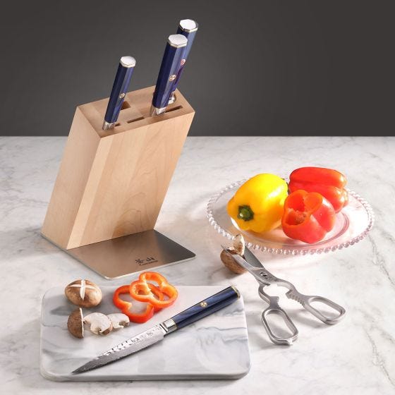 A sculpted maple wood storage block (available in natural finish) keeps your essential tools protected and close at hand, completing this modern statement set.