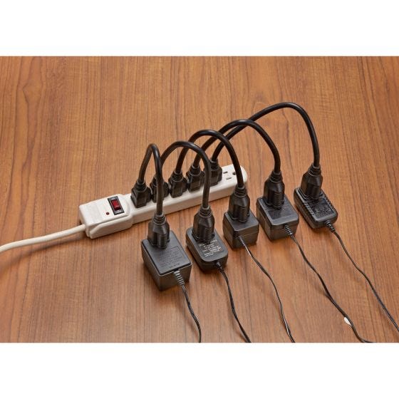 These Power Strip Extensions extend each individual outlet allowing more room for bulky transformers to be plugged in without covering up multiple outlets, meaning no outlet will go unused. Also great for wall outlets where bulky transformers may not fit. Each Extension measures about 14"L. Rated for 13A/125V/1625W. UL listed. Set of 5.