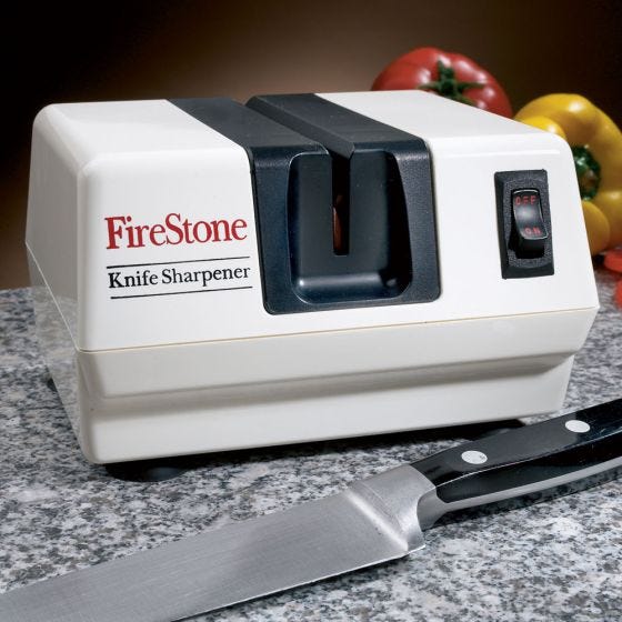 Most of the world's finest cutlery comes from the factory with a simple common edge angle. Conventional knife sharpeners will restore this angle, but our Ultimate Knife Sharpener goes one step further: it creates a hollow-ground edge, which has gently curved sides tapering to a razor-sharp point for unmatched sharpness. And, its special honing process removes less steel than other methods so high quality knives last longer. Counter-rotating diamond-enhanced discs facilitate one-step precision operation and keep the blade at the correct angle, producing a burr-free edge and eliminating the guesswork associated with hand sharpening. Four rubber suction feet hold sharpener securely on the counter. Operates on 115 volts; UL listed. 6"l x 5 1/2"w x 4"h. Made in the USA.